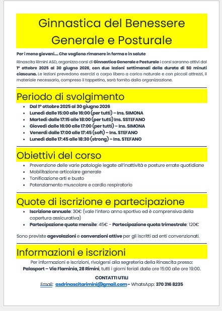 Rinascita Rimini ASD, organizza corsi di Ginnastica Generale e Posturale specificamente pensato per adulti e anziani che desiderano mantenersi attivi, migliorare la postura e svolgere un’attività fisica adatta alla propria età. Le lezioni prevedono esercizi a corpo libero a carico naturale e con piccoli attrezzi. Il materiale necessario, compreso il tappetino, sarà fornito dall’organizzazione.